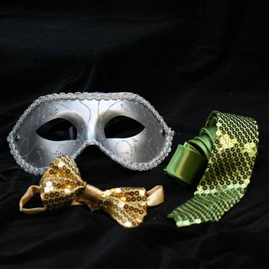 This is a series of party items that are sequined and finely finished in glitter. Items in this series include masquerade masks, bow ties and ties that can be custom made in any colour. These items are great for dress-ups or costume parties.