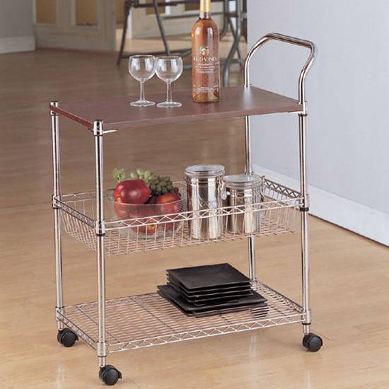 This serving cart features an simple yet elegant style. With a flat top, this serving cart is made for serving dishes and other use. The tow lower decks provide adequate storage for dishes, containers, trays and glasses, etc. The metal nature makes it strong enough to hold the utensils. The four wheels allow mobility.