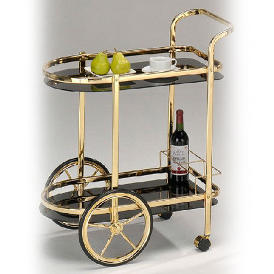 This is a serving cart with a dainty, deluxe and practical design. It features a highly durable structure in black and gold. This cart comes with two big wheels, two castors, and an ergonomic handles for easy movement.
