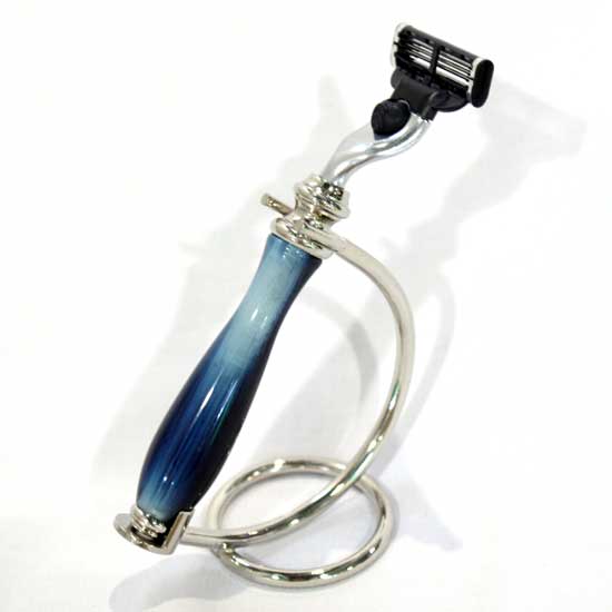 Shown is a men's razor with sharp blades. The razor is designed with a brass handle, featuring beautiful blue mottles. A slim metal stand is provided to place the razor with safety.