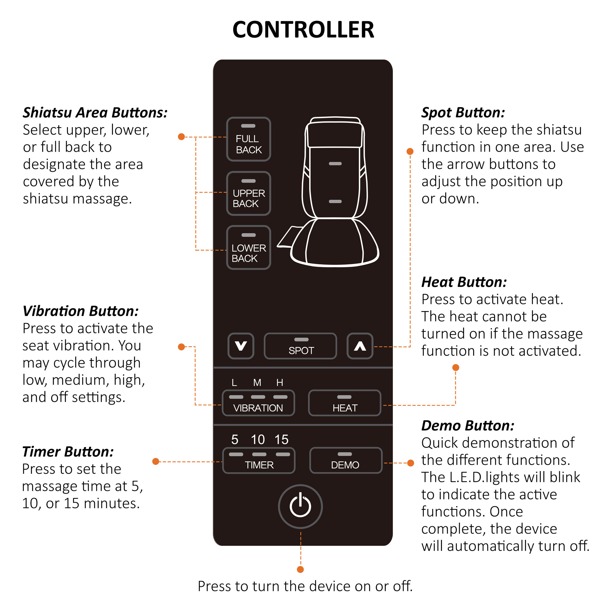 3. 3 massage zones can be selected: whole back, upper or lower back.