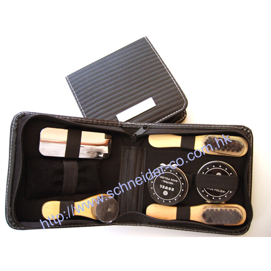 • Shoe Care Kit in A Circle Shape Sub Leather Case w/Snap Fastener Closure.
