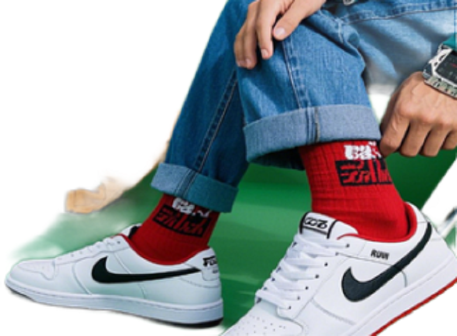 This shoe materials showcase features stylish white sneakers paired with eye-catching red socks. The sneakers are crafted from high-quality materials, ensuring durability and comfort—perfect for daily wear or sports. The red socks, made with soft, breathable fabric, feature bold graphic designs, adding a trendy touch. Together, they blend functionality with fashion, ideal for elevating casual outfits or supporting active lifestyles. Whether for street style or athletic moments, this combination delivers both performance and visual appeal.