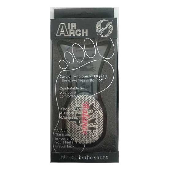This is a shoe pad featuring a unique design. The arch of the human foot plays a vital role in our everyday lives. The arches are responsible for maintaining our body's balance by evenly distributing your body weight over your feet. As with time, the arch of the foot will slowly decline resulting in flat feet. Flat feet can cause various physicals symptoms, such as lower leg pain and misalignment of the spine. Our product was specifically designed to provide support to the arch and prevent the flattening of the feet. The patented design of our product relieves stress on the heel by providing a cushion of air that absorbs shock. As the heel presses against the cushion, the air bag expands the air towards the arch of the foot. This design allows the airbag to protect the heel from strong impact and provide arch support.