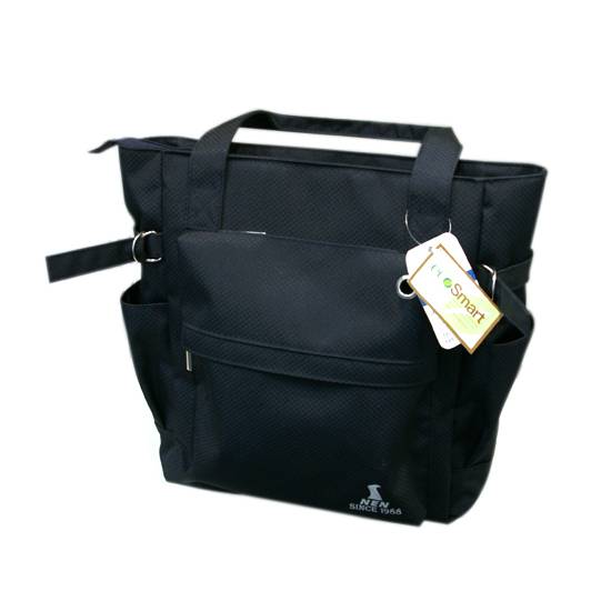 This is a black coloured shopping bag which is made of environmentally friendly materials. The shopping bag is zippered and is handled for easy carrying.