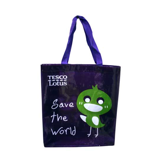 This high-quality plastic shopping bag can bear heavy weight. The surface of the bag features words "save the world" and a cute green bird print. Finely manufactured, the bag can be used for a long life.