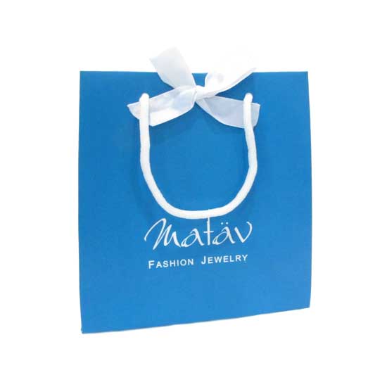 This is a shopping bag made of quality paper. It is crafted in a classical rectangular shape in bright blue. The white stripes and ribbon complete this bag for an elegant and chic look.