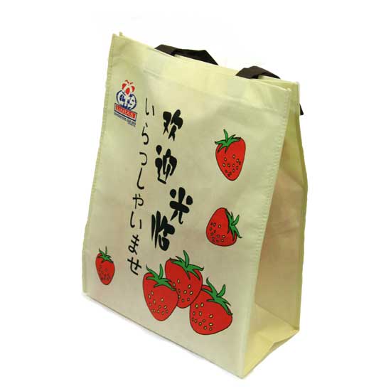 Displayed is a shopping bag featuring strawberry images for a cute style. Made of nonwoven fabric, this shopping bag is light and durable. Take this lovely shopping bag with you and live a green lifestyle.
