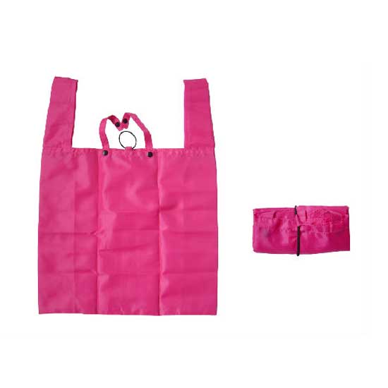 Displayed is a shopping bag that comes in a cheerful pink color. Made of high quality material, this shopping bag is durable and can hold heavy grocery items. This shopping bag can be folded to a small pack when not in use for saving space.