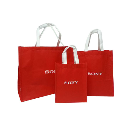 This is a shopping bag in red with white handles. Your logo can be printed on it for promotional use. There are assorted sizes available for you to choose from.