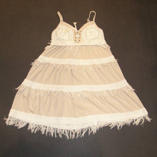 This is a short flowy baby-doll dress designed for ladies. It is in a warm creamy beige color. It features a crocheted upper body.