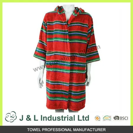 A loose fit design highlights this bathrobe. Going without a fabric belt for an unfettered feel, it features medium sleeves and two side pockets, and the colorful stripes enhance the appearance of the garment. Made 100% of cotton with a velour finish, this bathrobe will ensure that you have a cozy evening after shower.