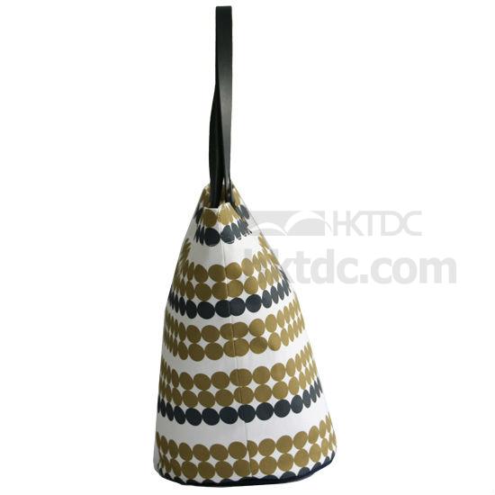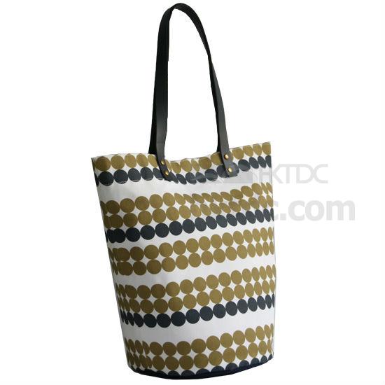 This Nordic modern tote bag is handcrafted from high quality materials with an original print of circles in a trendy arrangement. Including the classic features of two interior pockets and a leather strap handle, this stylish tote bag is both functional and sturdy for daily use.