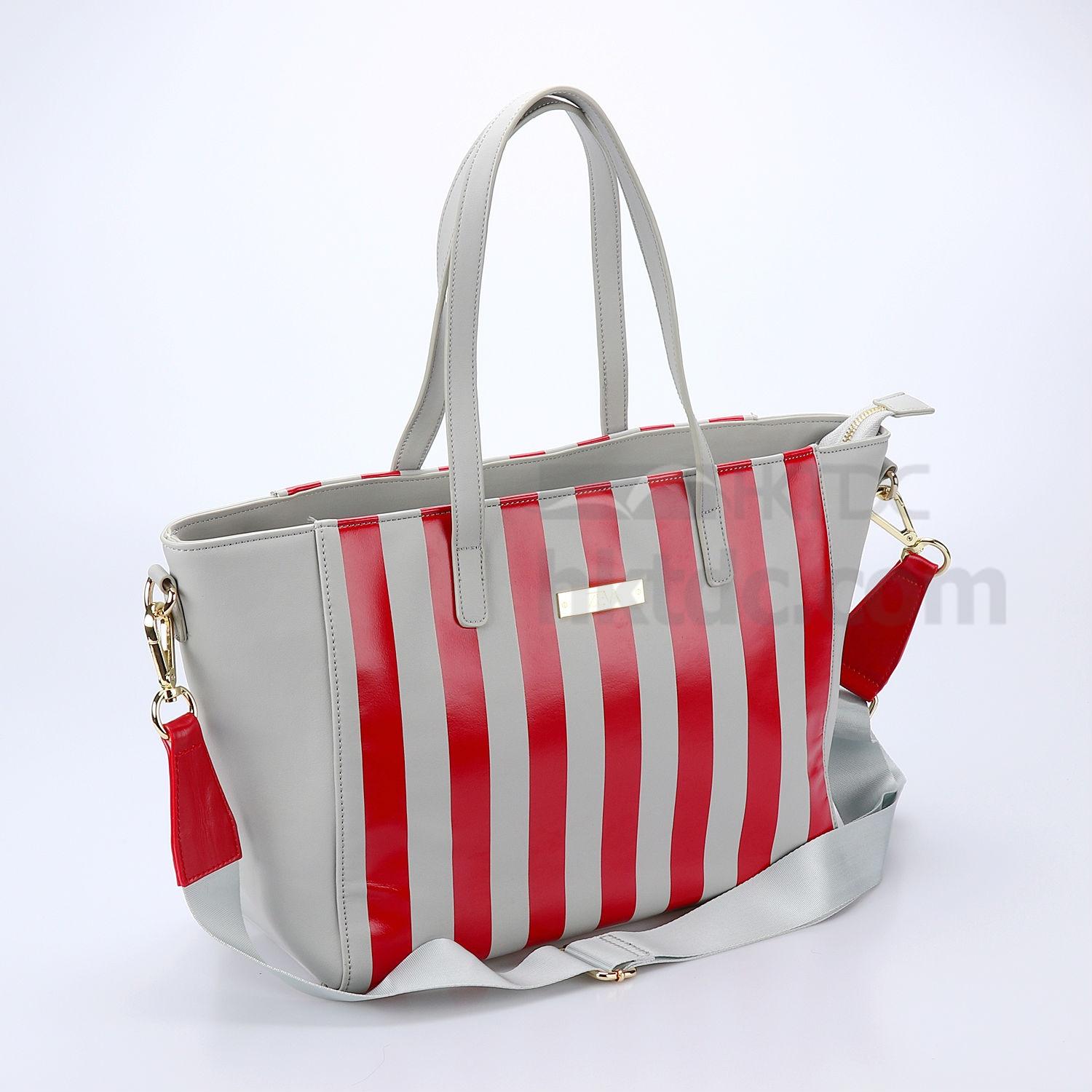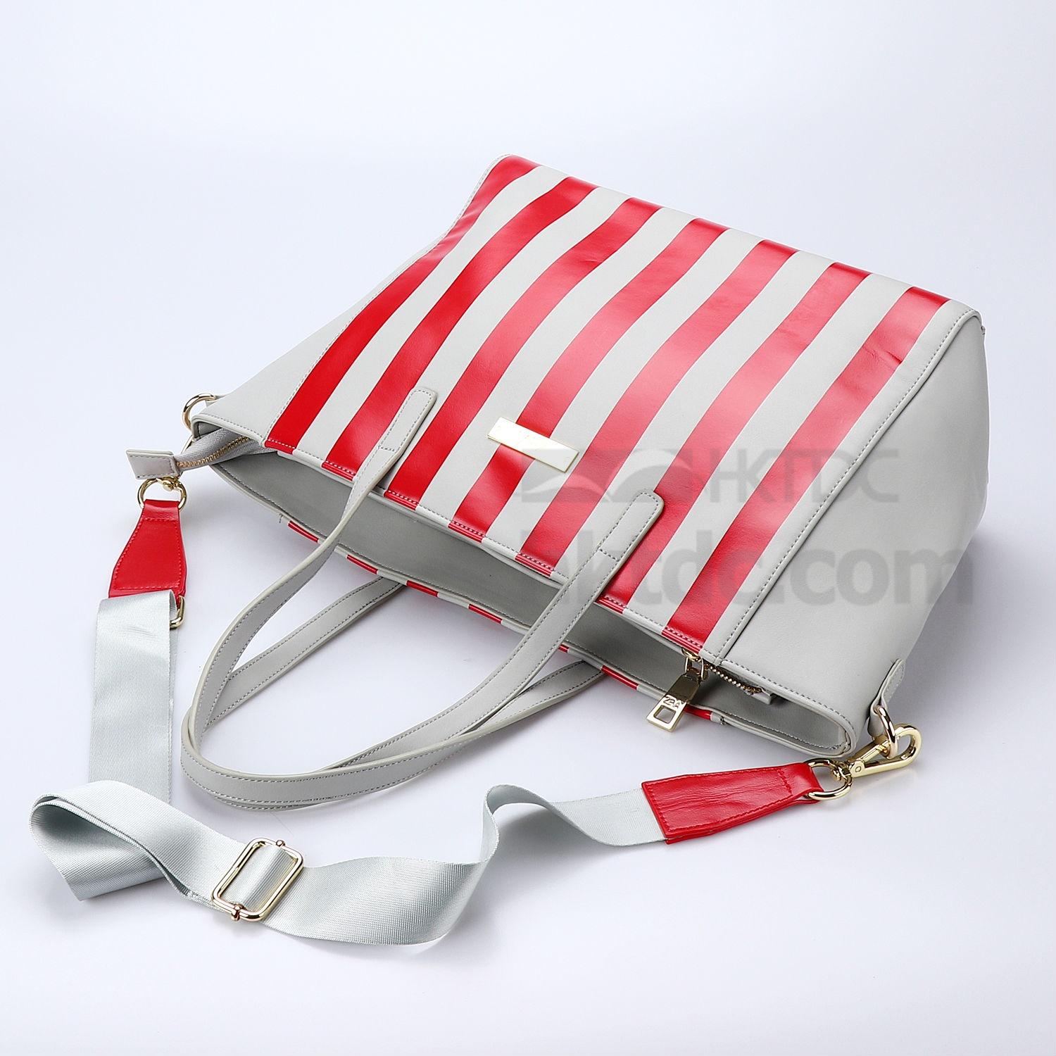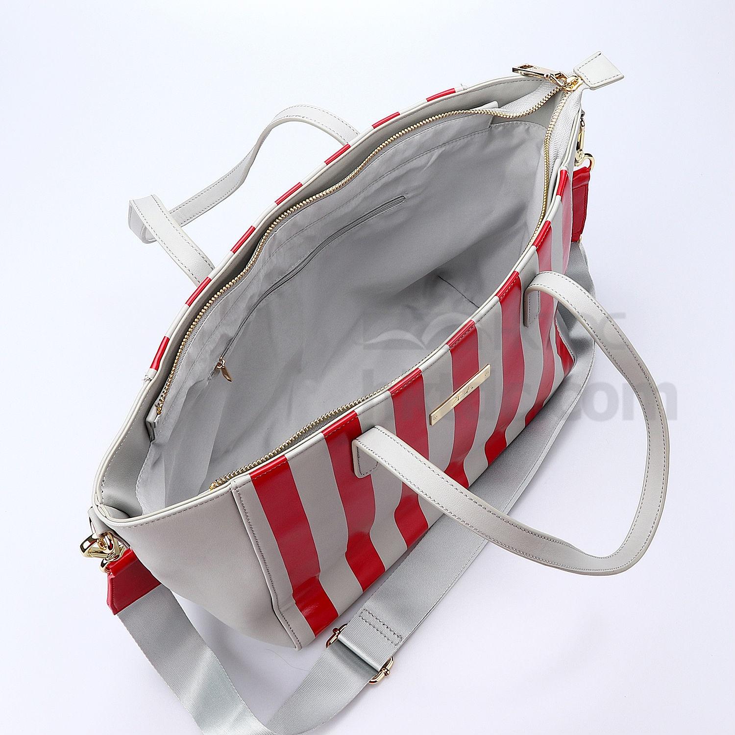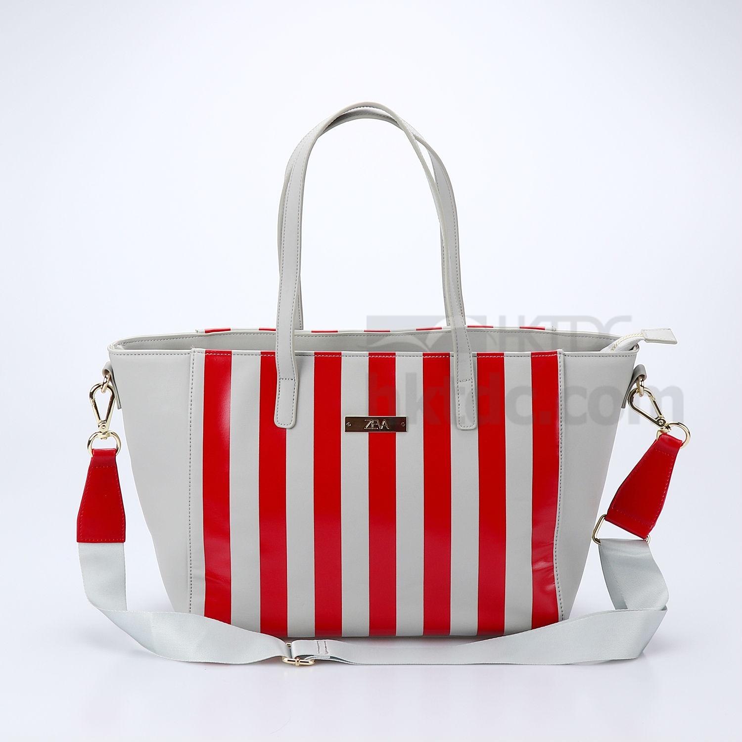 The pictured shoulder bag is designed for ladies and has a white body printed with geometric red lines. It has a large main compartment and has a zipper on top to ensure secure and organized storage. This ladies’ shoulder bag and has a pair of long handles on top and comes with a detachable shoulder strap for carrying.