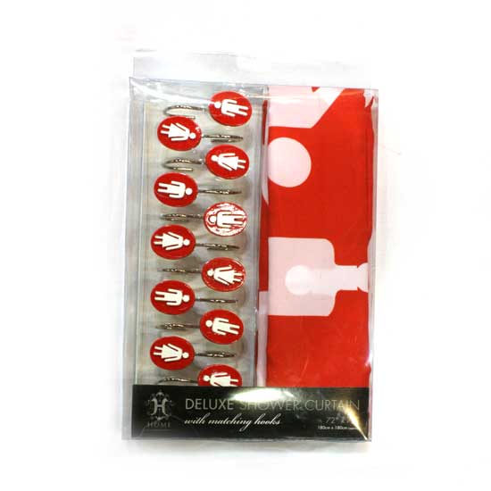 Give your bathroom a new look with this captivating shower curtain. This shower curtain features a red exterior with white male and female prints for a sense of playfulness. The shower curtain also comes with matching hooks that guarantee secure hanging.