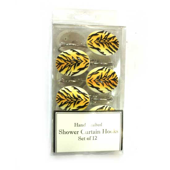 Here displayed is a set of shower curtain hooks. The shower curtain hooks feature an alluring leopard pattern for a chic and contemporary touch. Made of resin, these hooks promise robust construction and secure hanging.
