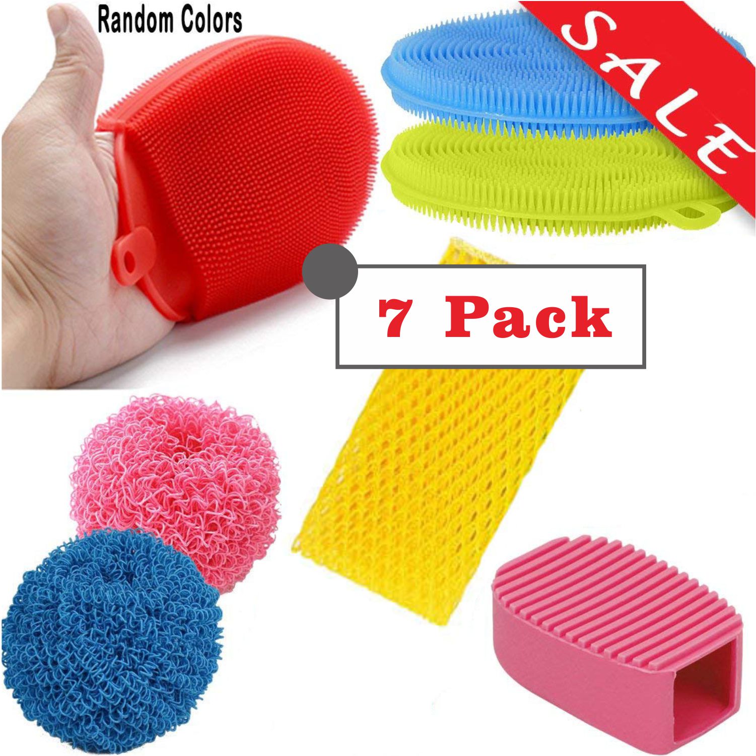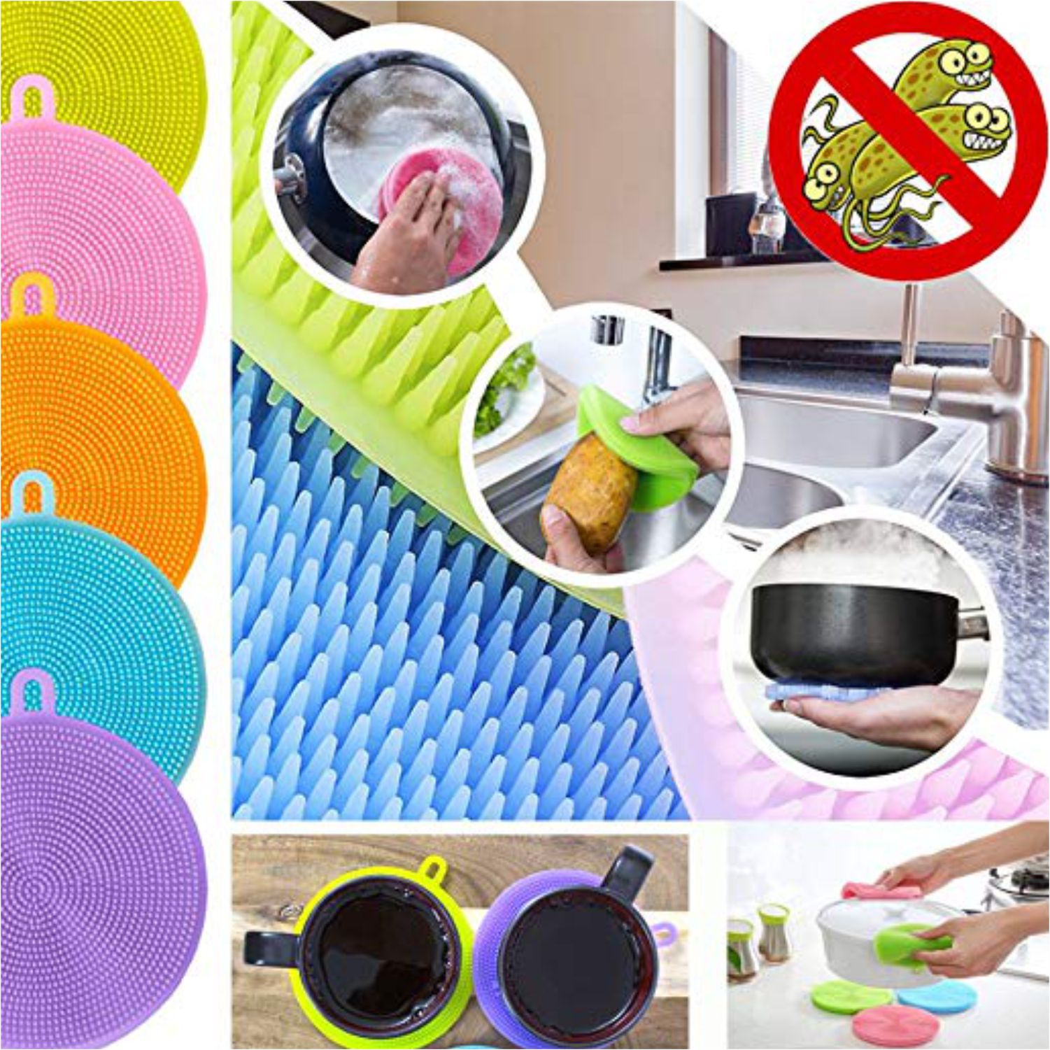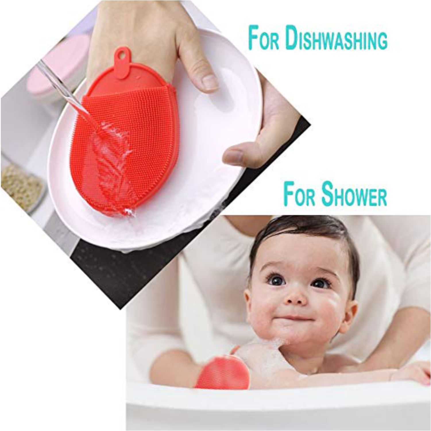 TWO SILICONE ROUND BRUSHES + ONE HALF-GLOVE BRUSH: Soft speedy natural drying bristles for light washing (dishes, plates, pan, fruit, vegetable and so on), No residue, Easy to reach the corners of glasses and cups, Heat insulation properties, and can be even used for Shower.