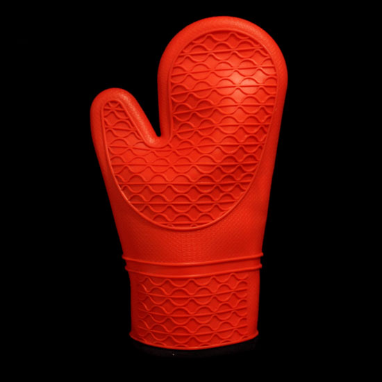This pictured kitchen flaunts a reddish orange hue. Made of silicone, this glove is heat resistant. This silicone glove is ideal for kitchen use.