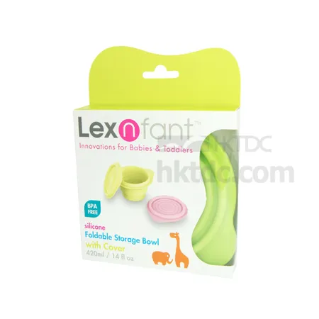 A foldable storage bowl that folds up with its cover. The bowl and cover are both made of silicone, so they will not break or crack. Folds up in half, allows for space saving and easy shelving. Comes in large and small sizes.