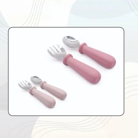 Our kitchen products have cleverly designed details that suit very young children. The spoons and forks have short, thick handles that are easy for small hands to grip, and their shape makes scooping up food easier. They can rest against the edge of the plate without slipping down, while the ring on the handle prevents your child’s hand from sliding down too far. They’re perfect when your child wants to learn to self-feed.