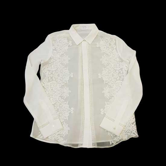 This is a silk blouse with long sleeves. Featuring beautiful embroidery on the sides, this blouse is semi-transparent for a fashionable look. This high quality silk blouse is soft and smooth.