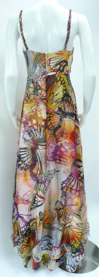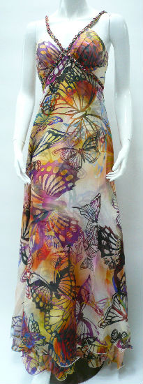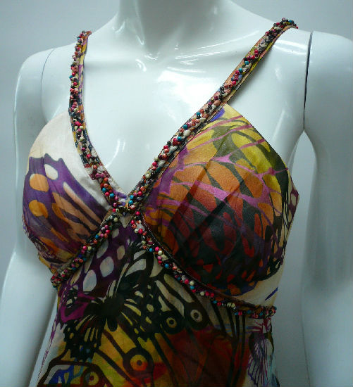 It is a floor-sweeping dress in ligh weight silk to create a beautiful movement when walking. Mixing colors of beading as shoulder strap and around the chest. It also maximize the silhouette with heels.