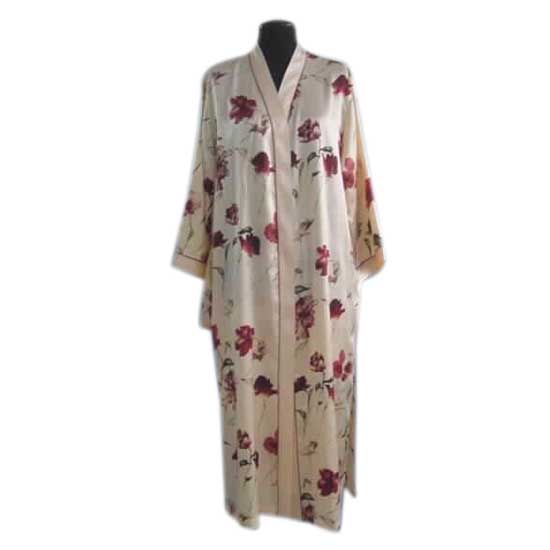 This silk robe features an elegant floral pattern that gives off a romantic sense. The velvety silk construction offers a sheer fit with extra comfort. This silk robe is a good addition to ladies' closets.