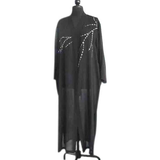 Photographed is a silk robe with a see-through design for added elegance. The bodice is adorned with shiny sequins to create an elegant figure. This silk robe is an ideal choice of nightwear for chic ladies.