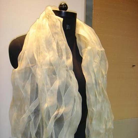 This deluxe scarf features unique ruffled fabric for a feminine style. Made of 100% fine silk, it has a distinctive lustrous sheen and a smooth, soft texture. Indulge in cozy comfort with this luxurious silk scarf.