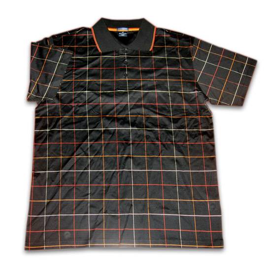 This is a men's silk shirt that is black in color, with a multi-colored striped pattern.