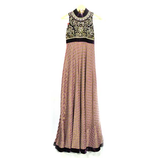 This featured sleeveless gown is designed with elaborate beaded patterns on the bodice. The floor-length skirt serves to elongate the body and it moves beautifully as the wearer walks. The modest velvet trimming at the hemline finishes this gown beautifully.
