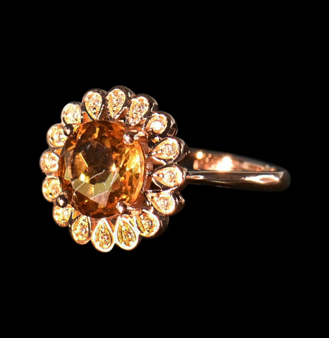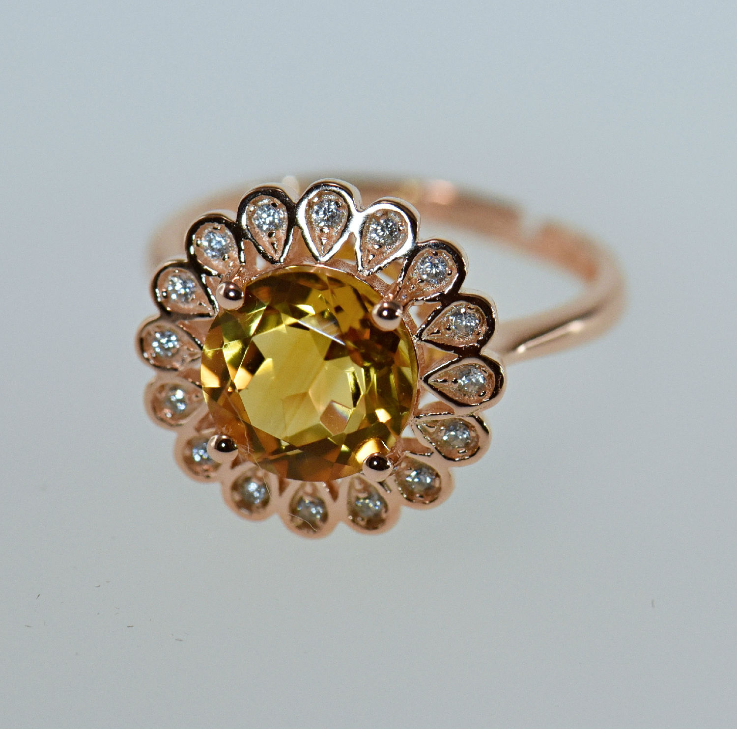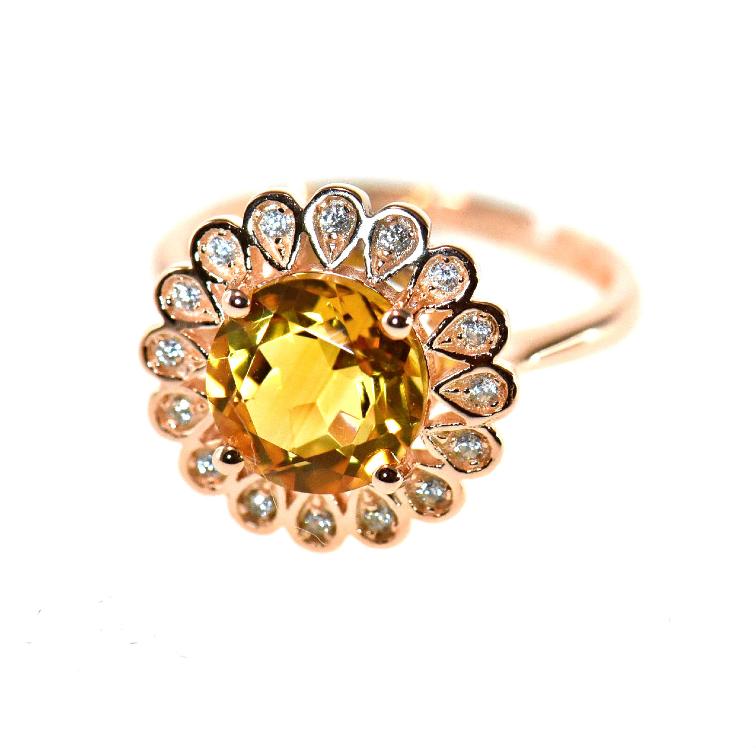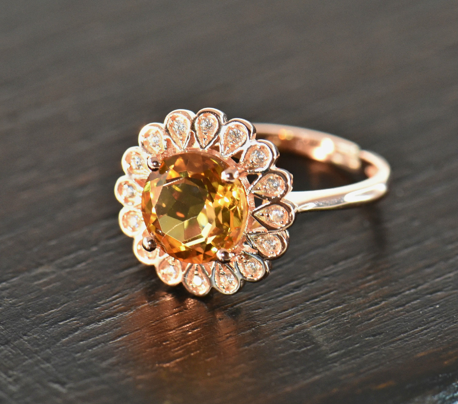Highlighted here is an opulent ring in a daisy design. The ring features a natural 8 x 8 mm citrine stone at the center, which is surrounded by small cubic zirconia stones as flower petals. Plated with 18K rose gold, this ring looks dazzling and classy on every lady.