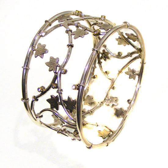 This is a silver bangle with botanical design. The bangle is made of sterling silver and decorated with sparkling stones.