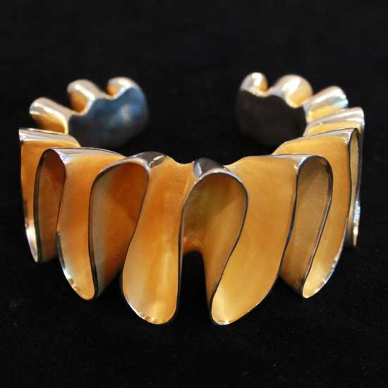 The silver-made bangle comes with an eye-catching corrugated design. It is plated with gold for enhanced attractiveness. This bangle is also an exclusive design of our company.