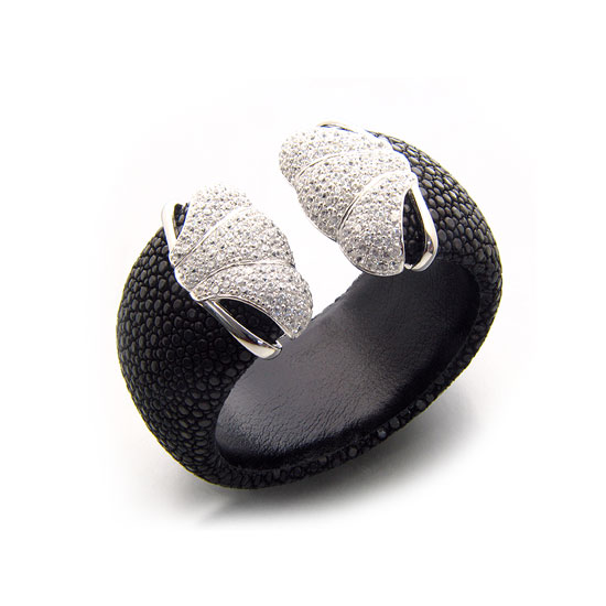 This bangle boasts a stunning and fashionable design. It features a genuine stingray leather structure with silver caps. The caps are set with sparkling CZ stones for added uniqueness and style.