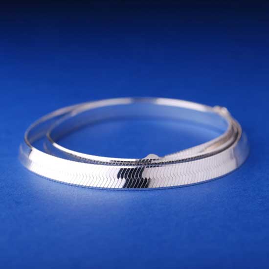 The sterling silver chain boasts a stylish look in a flat and compact style. The surface is finely polished to give a mirror appearance. This chain looks great alone or with pendants.