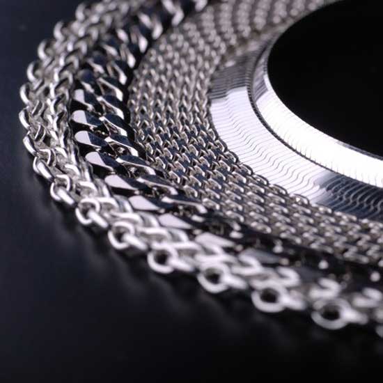 Showcased is a series of stylish chains made of sterling silver. It comes in various styles such as cable, hollow and flat. The surfaces of the chains are polished to give a shiny touch.