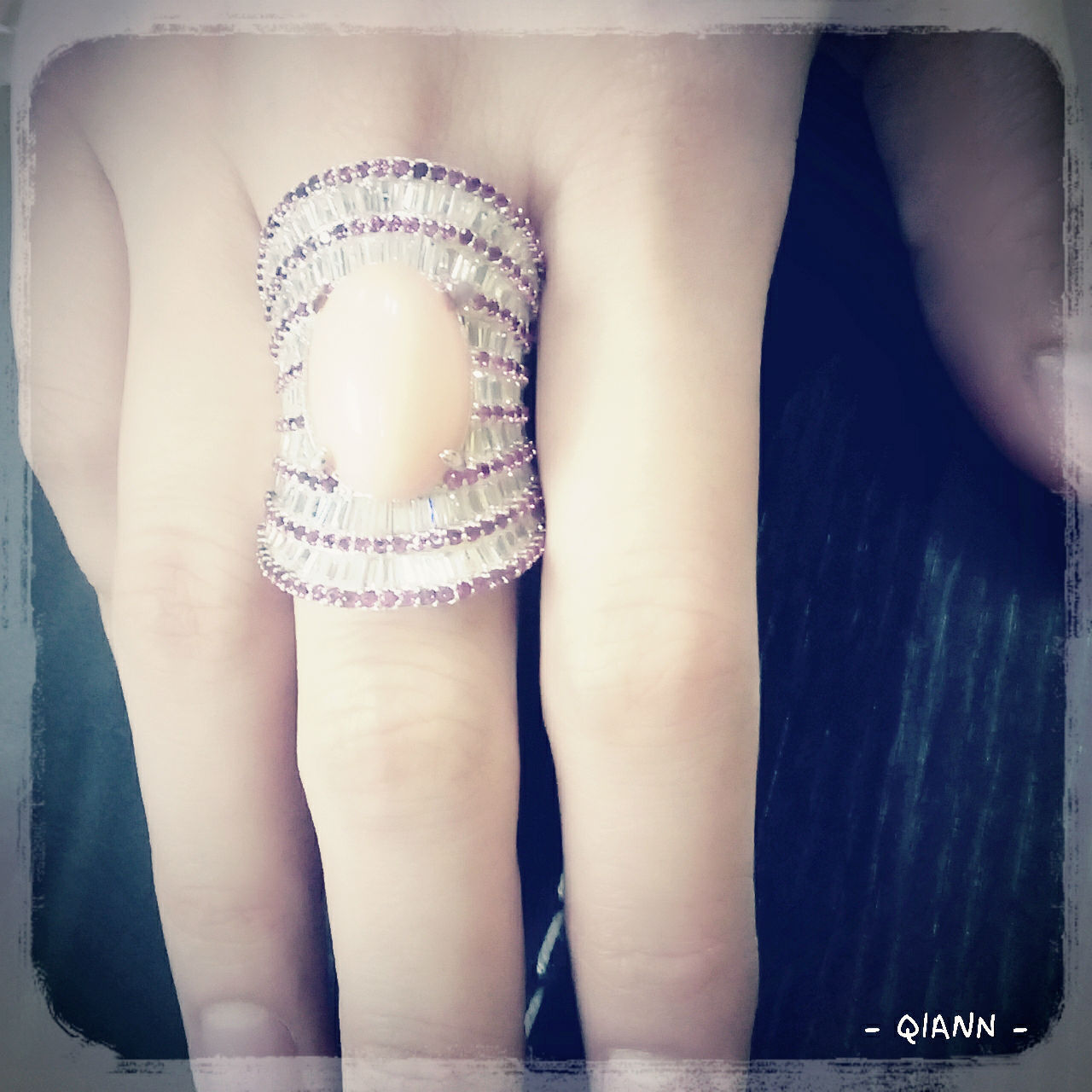 This is an oversize sterling silver pink Coral ring set with top quality white Cubic Zirconia.