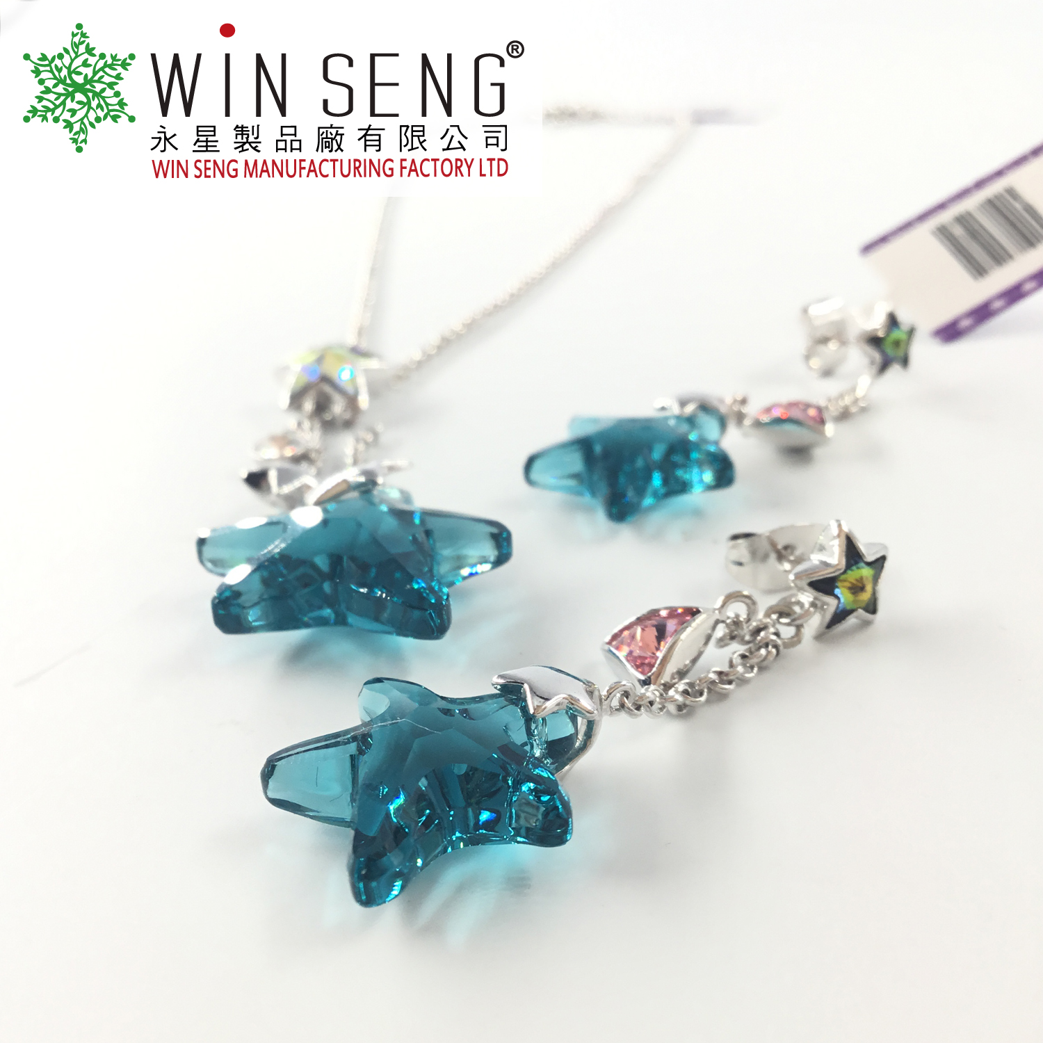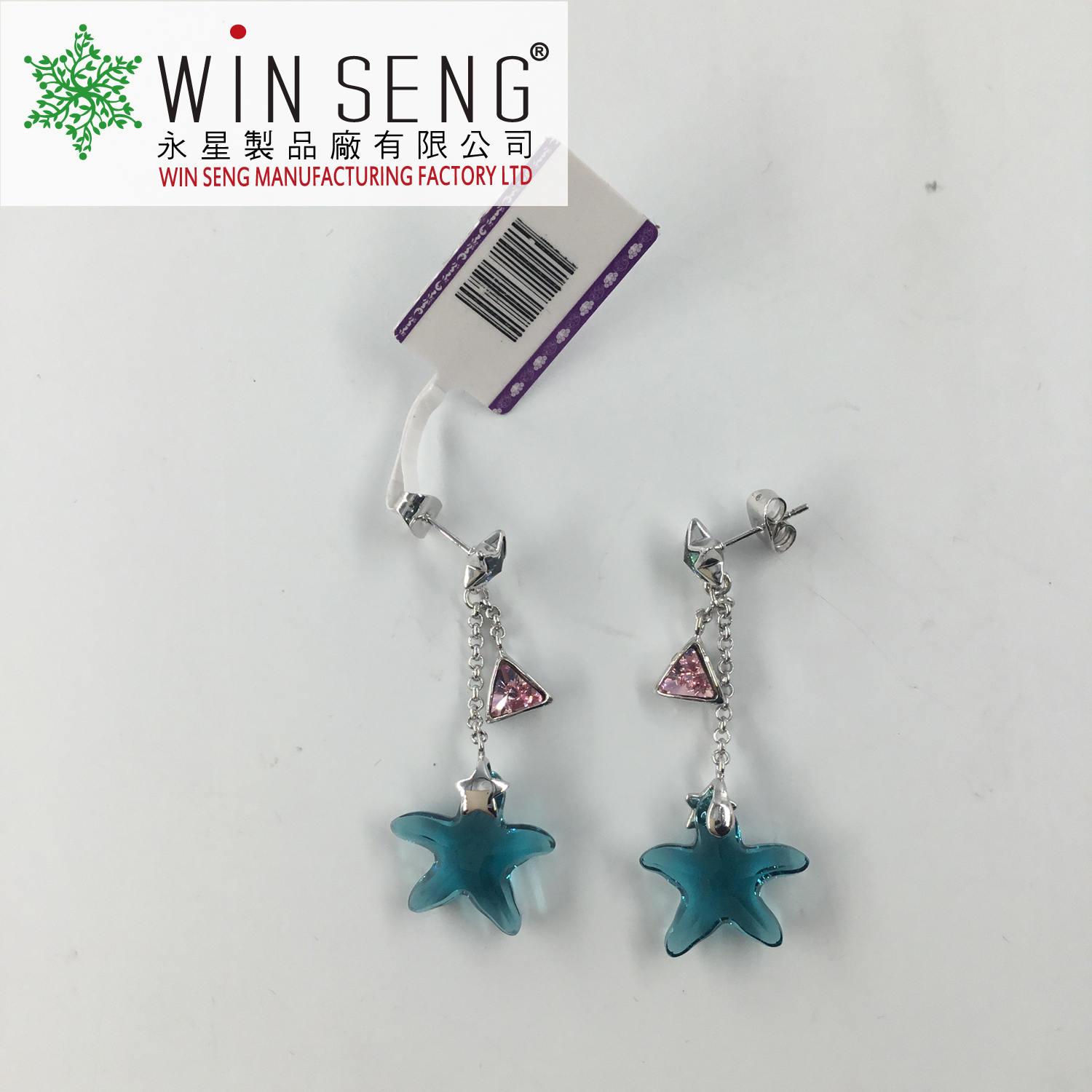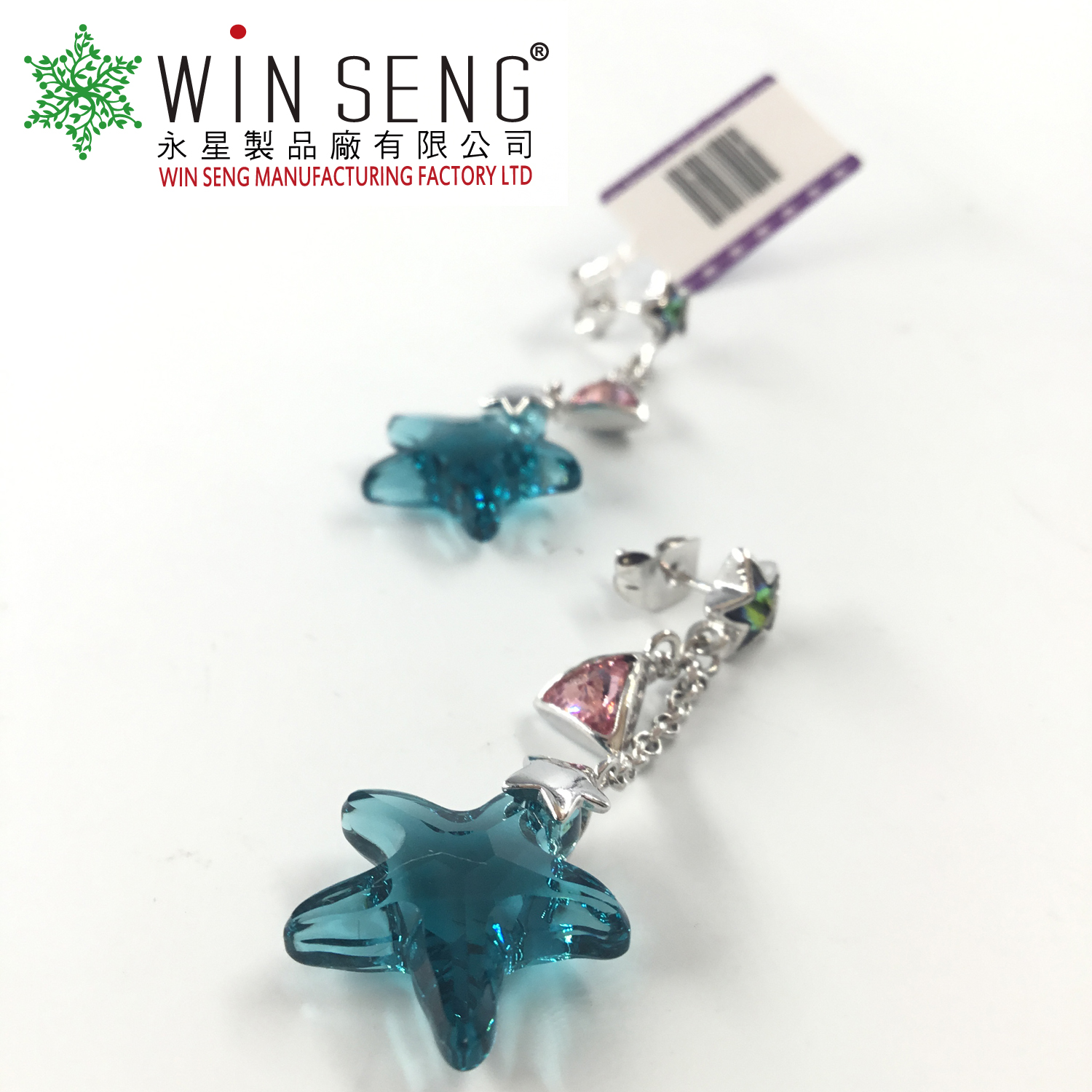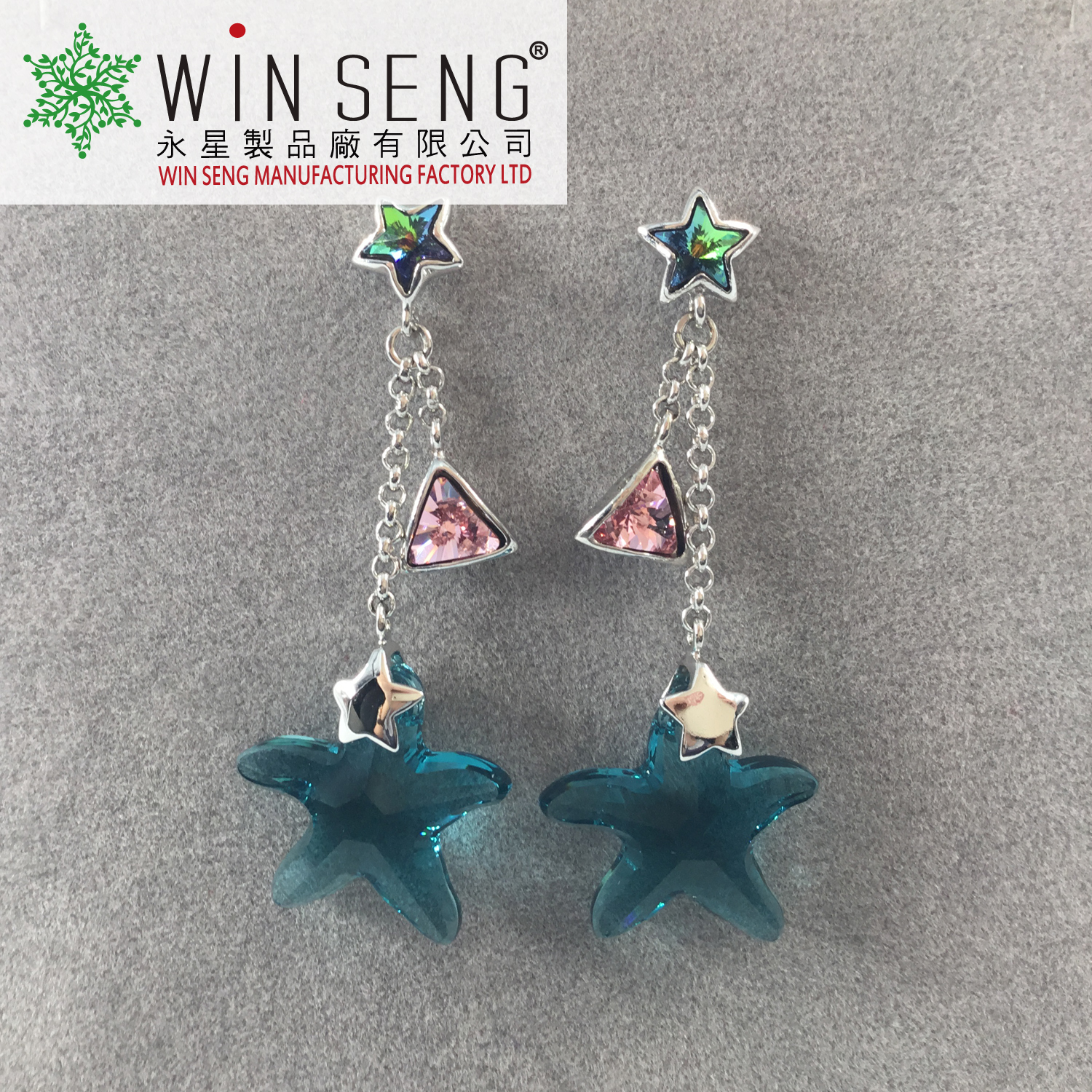 This earring is made of silver and is embellished with crystals from Swarovski. It features a large blue star crystal as the main stone and is accented with smaller charms in star and triangular shape. The earring flaunts a glamorous and eye-catching design and is perfect as a gift for ladies.