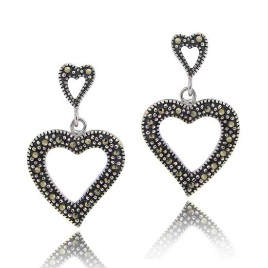 Showcased is a pair of earrings in adorable heart shapes. They feature a sterling silver construction with marcasite accents. These earrings are delicately made to offer a polished finish.