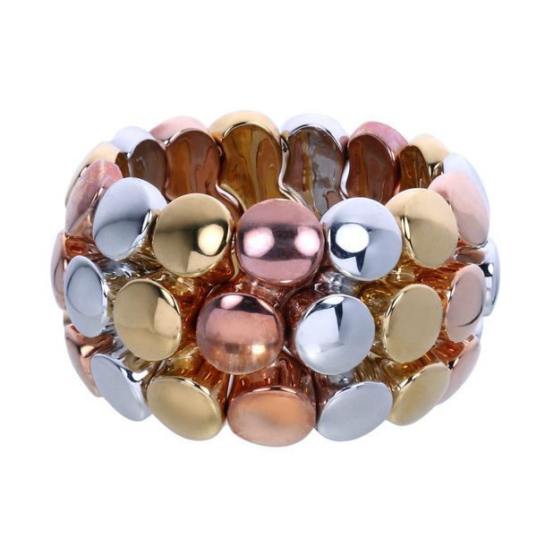 This is a bold super light weight sterling silver strech bracelet plated in 3 different colors, yellow gold, rose gold and white gold. Utilizing our silver electroform production technique, we are able to reduce the silver weight of this strech bracelet significantly. In today's high silver and precious metal prices, we are able to use the silver electroform technology to produce bold looking and fashionable jewelry pieces at an affordable price. At the same time the jewelry pieces can be seen as an investment since these fashionable jewelry are made from precious metal.