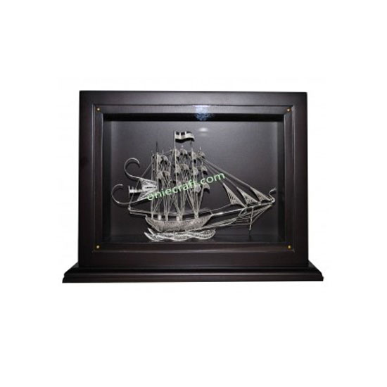 This is a silver frame with an all-black finish. A sailing vessel model is placed inside the frame. Surprise your incoming guests with this sophisticated home decor.