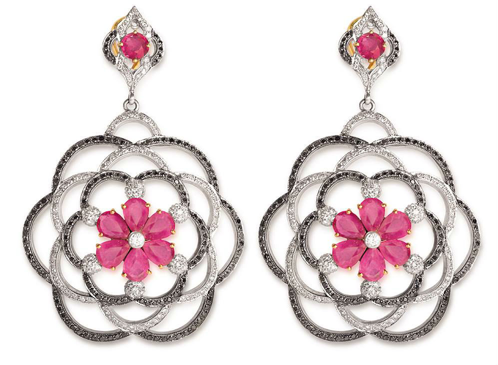 Silver Gold White & Black Diamond Ruby Earring