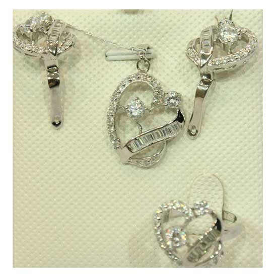 Showcased is a four-piece silver jewelry set with a pair of earrings, a ring and a pendant. They showcase a heart-shaped design with a shiny CZ stone setting. This silver jewelry set complements your daily outfit easily.