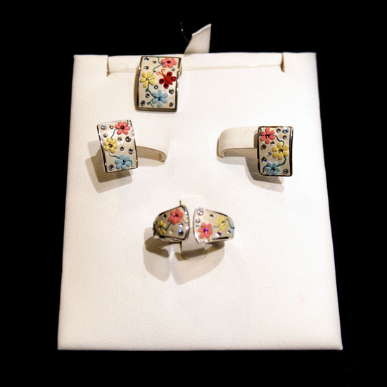 This silver jewelry set comprises a pendant, a pair of earrings and a ring. Colorful flowers detail gives this set a sweet, girlish touch. The simplistic, original design attracts women of any age.
