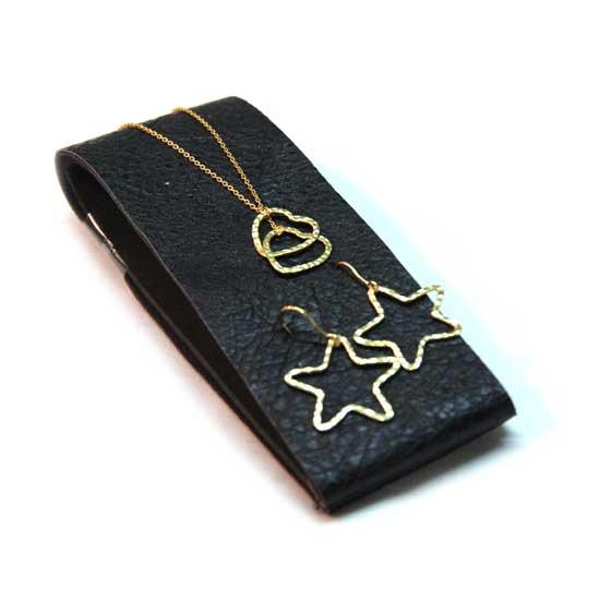 This is a jewelry set that includes a necklace and a pair of earrings. The necklace comes with two heart-shape embellishments and each earring boasts a star design. They are made of high-quality silver with glossy golden surfaces.