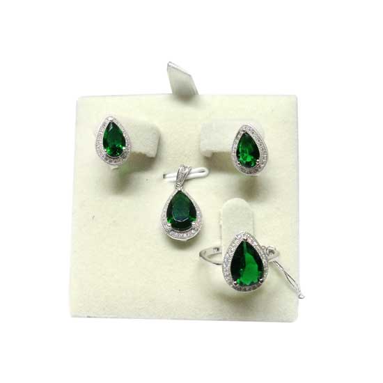This silver jewelry set includes a pair of earrings, a finger ring and a pendant. A green sweet teardrop-shaped stone makes a gorgeous centerpiece for decorating each jewelry piece. Finely crafted of silver, this jewelry set shimmers with a highly glossy finish.