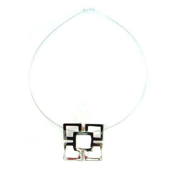 This silver necklace looks stylish because it is mainly formed with geometric patterns. It features a patterns of five squares. The one situated in the middle is slightly larger than the other four. The five squares are empty in the middle.