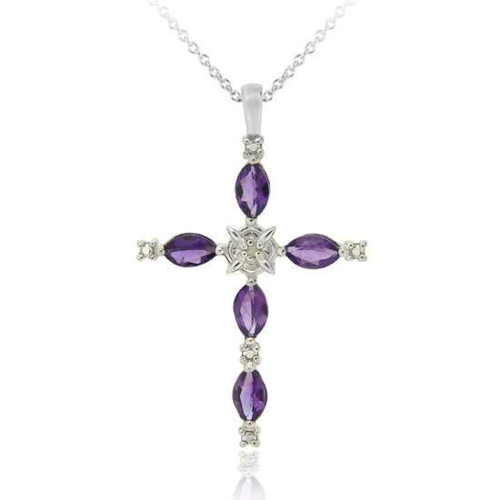 Featured is a delicate cross-shaped pendant made of sterling silver. It is accented with amethyst for a decorative touch. This pendant is crafted with fine workmanship to give a polished finish.