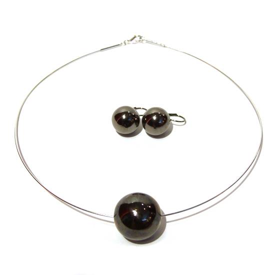 This jewellery set include 925 silver plated Rhotanium necklace and earring. Each piece have a black ornament in spherical shape. They feature wire finding in silver color.
